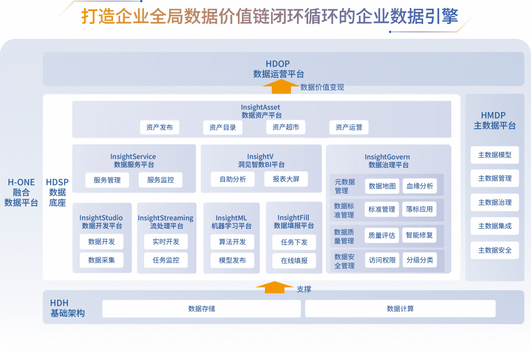 H-ONE融合数据平台包含四大一级平台,包括基础架构Hadoop发行版HDH、数据服务平台HDSP、主数据管理平台HMDP、数据运营平台HDOP。八大二级平台,数据开发平台InsightStudio、流处理平台InsightStreaming、机器学习平台InsightML、数据填报平台InsightFill、数据治理平台InsightGovern、数据资产平台InsightAsset、数据服务平台InsightService、洞见智数BI平台InsightV。
