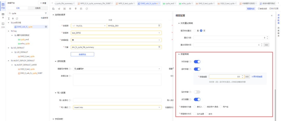 灵活调度配置,可视化告警配置,支持任务(流)的失败、超时、延时告警,给予多种通知方式,支持站内信、邮件等方式,提高消息的触达率。