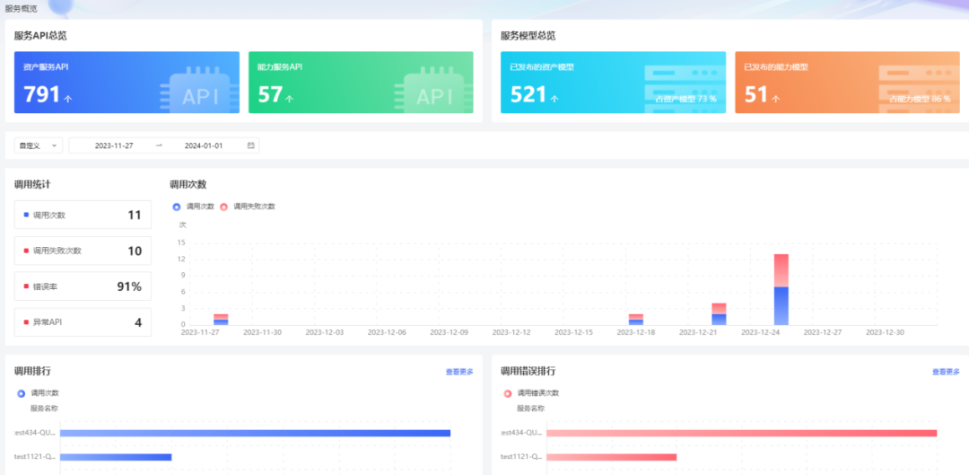 数据服务运营可视化,服务动态全盘掌握。服务看板支持全局查看数据服务调用情况,便于数据服务的持续运维和管理。