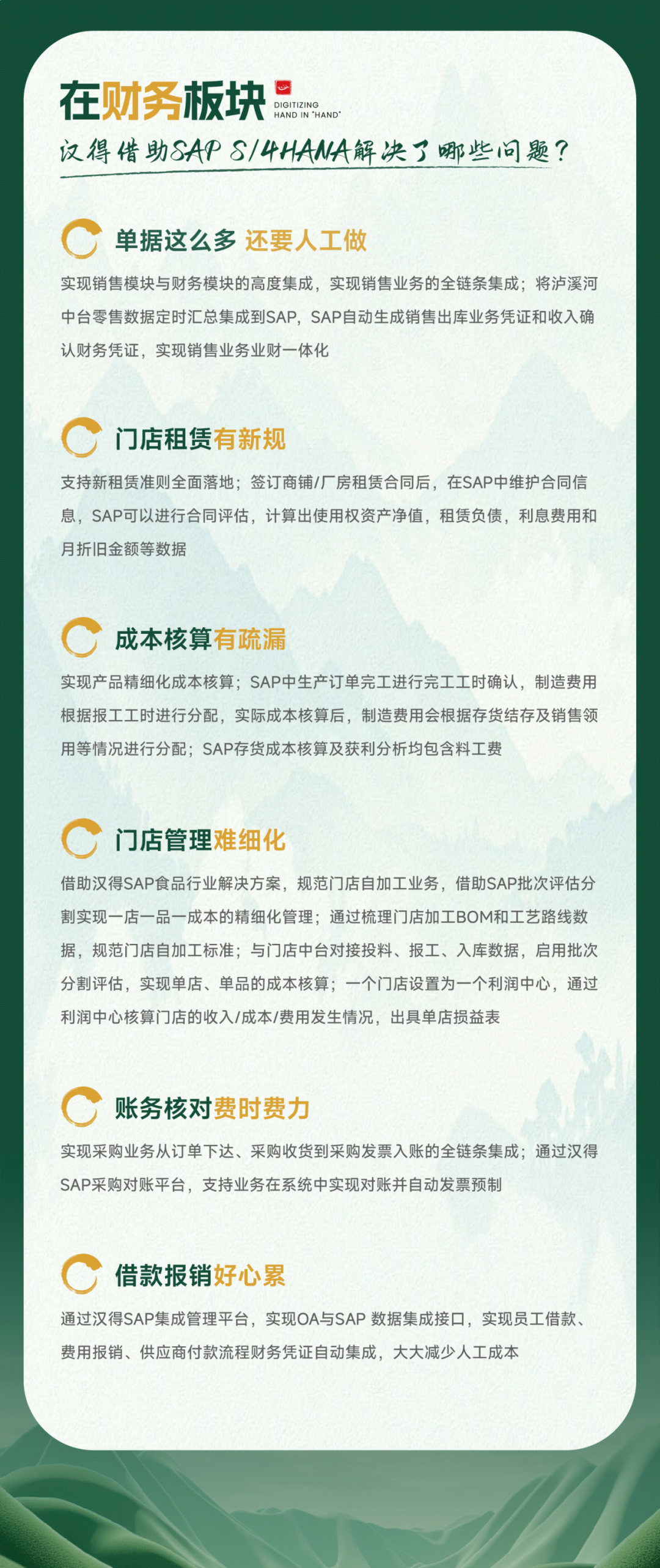 近期,泸溪河携手万象城AWC成功上线 SAP S/4HANA 项目,并已顺利完成全国超430家门店34家公司的部署推广。顺利获得此次合作,万象城AWC为泸溪河全面打造数字化运营核心体系,成功搭建起以 SAP 为核心,支撑集团化管控、规模化扩张的企业级统一运营平台,将有效统筹管理集团层、中央工厂层、销售分公司层与门店子公司层级的各项业务流程,有力有助于泸溪河数字化建设登上一个新的台阶!共燃新中式糕点品牌复兴之路万象城AWC x 泸溪河作为新中式点心领先品牌,泸溪河当前正处在高速开展阶段,然而企业所使用的系统已无法满足集团化、多公司和多业态的规模化的战略扩张目标。同时,随着泸溪河线下门店数量及业务量快速增长,急需构建起集团统一的主数据管理体系、实现业财一体化,才能支撑起泸溪河长期的数字化建设需求。在经过全面考察和深思熟虑后,泸溪河最终决定引入 SAP S/4HANA 系统,携手万象城AWC共同打造数字化运营核心体系!在项目进行过程中,万象城AWC团队为保证项目进度按计划推进,各业务部门间通力协作,在历经调研、蓝图规划设计、系统实施、试点及推广单位上线后期服务保障等多个阶段后,最终完成了超过430家门店业务的对接与运行,并确保 SAP 以及周边系统上线后均稳定运行。同时为了保证系统切换后泸溪河各门店及公司的月结和年结顺利,万象城AWC顾问在项目后期不仅始终活跃在一线现场给予专业技术支持,还及时组织安排培训和交接工作,保证关键用户及内部顾问能够接手后续运维工作。此次泸溪河 SAP S/4HANA 项目共涉及公司34家,门店数超430家,周边系统接口及开发项200余项,自定义角色1000余个,门店月度要货数50+W;财务凭证数(年)达1500+W。项目的成功上线,不仅帮助泸溪河实现 ERP 系统与 OA、营运中台、对账中台等系统的业务和数据集成,确保集团的整个信息流实时、高效、准确地传递,还明确了会计核算规范,优化门店运营、门店制造、工厂计划、工厂生产控制和物流体系,提高整体管控水平,为公司的各项业务召开,给予强有力的数字化保障。作为国内领先的企业数字化综合服务商,万象城AWC始终致力于成为连接企业管理与数字化技术的桥梁,不断提升交付质量与效率,努力为客户带来更好的数字化体验!携手万象城AWC,成就强品牌梦想!