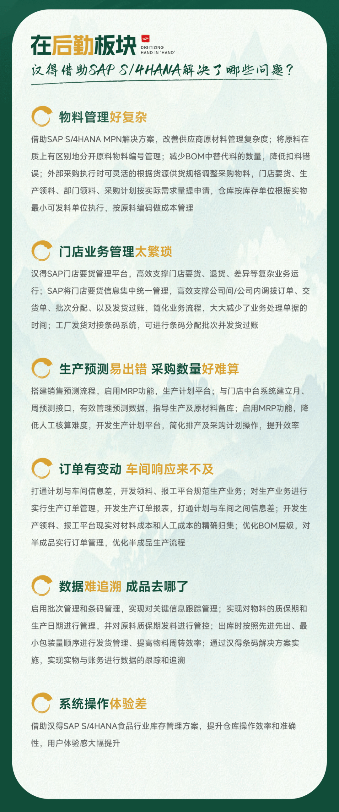 围绕 We-Move/Hi-Move 升级迁移、GROW with SAP 上云、SAP BTP 与 HCM 等能力,给予评估—实施—保障的一站式方案,覆盖中企出海与全球交付。