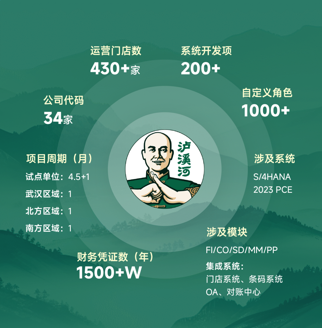 此次泸溪河 SAP S/4HANA 项目共涉及公司34家,门店数超430家,周边系统接口及开发项200余项,自定义角色1000余个,门店月度要货数50+W;财务凭证数(年)达1500+W。