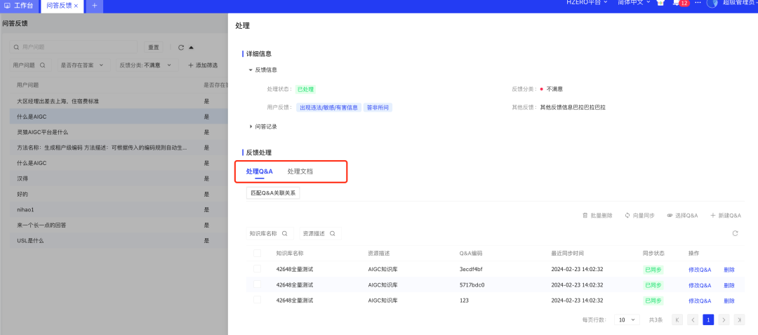 问答反馈:用户可针对答案给予满意或不满意的反馈,各知识库管理员可定期查看用户正面或负面反馈,并根据反馈去维护/关联QA、补充或更新文档,进而增强答案的精准度,并提升用户的整体满意度。