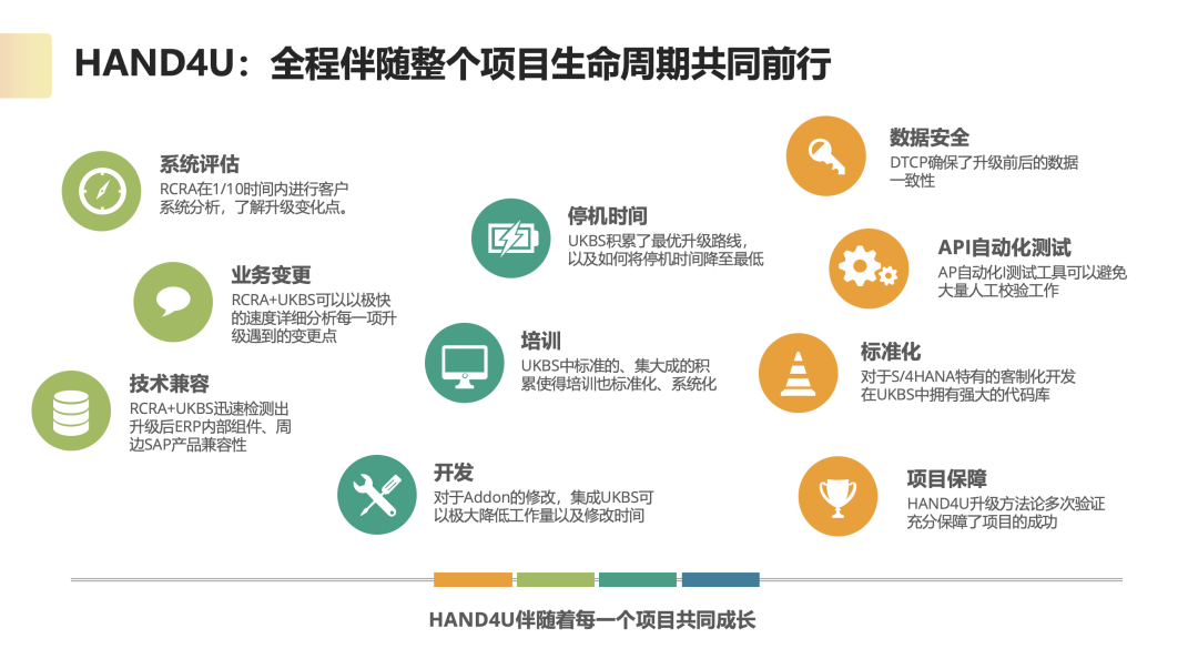 万象城AWC自主的系统升级工具 HAND4U 具备覆盖评估、准备、切换和验证等各个环节的能力,可以全程伴随整个项目生命周期共同前行,帮助企业的传统 SAP 系统在升级上云过程中提高效率,快速实现系统迭代,并确保项目成功。