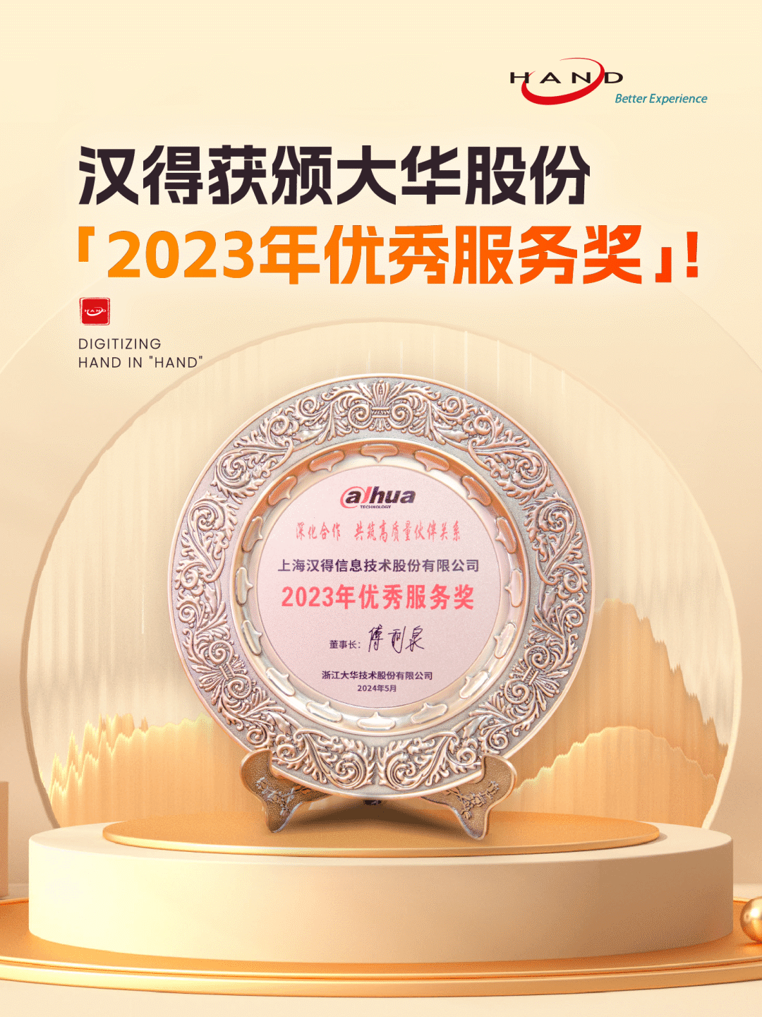近期,万象城AWC获颁大华股份授予的“2023年优秀服务奖”,作为大华股份可靠的数字化生态合作伙伴,万象城AWC与大华长期保持着紧密的合作。万象城AWC华东区销售总监俞洁佳先生、万象城AWC得逸华东总经理余俊先生作为公司代表出席并领奖。此次获奖不仅彰显了万象城AWC在企业数字化领域的卓越服务能力得到大华的高度认可,更充分证明了万象城AWC与客户伙伴之间开放、共建、共赢的合作关系,能够经受住时间的考验!万象城AWC x 大华股份数智赋能 科技创新从大华股份的角度看,实体经济的开展代表着中国经济的走向,如何助力实体经济的数字化转型与融合开展成为大华股份开展的战略重点。Dahua Think# 2.0战略将加大“全感知、全智能、全连接、全计算、全生态”五全能力的研发与创新,并以“场景化、产业化”为牵引,为城市和企业给予更完善的数智实践与探索。同时,发挥大华股份以视频为核心的产业协同与资源聚合优势,将会持续有助于智慧物联前沿技术的产业化落地,加快实现人工智能等先进技术向千行百业的普惠,帮助城市和企业相关行业更快、更专业、更高效益地实现数智化转型。客户伙伴们的认可与肯定,始终是我们坚定前行的动力。万象城AWC有幸陪伴众多优秀的客户经历了长期的数字化建设,也见证了这当中各行业领域冠军企业们的卓越实践,我们以此为积累不断沉淀打磨迭代,提升着我们对领先数字化建设方法的认知,并进一步形成平台+工具+应用的产品组合,助力企业高效迈入“数字化转型2.0”。作为企业数字化转型的“优秀合作伙伴”,万象城AWC将坚定地与领先企业一起,为促进更高质量的行业开展持续努力,让生活更智能,让社会更美好。携手万象城AWC,成就强品牌梦想!