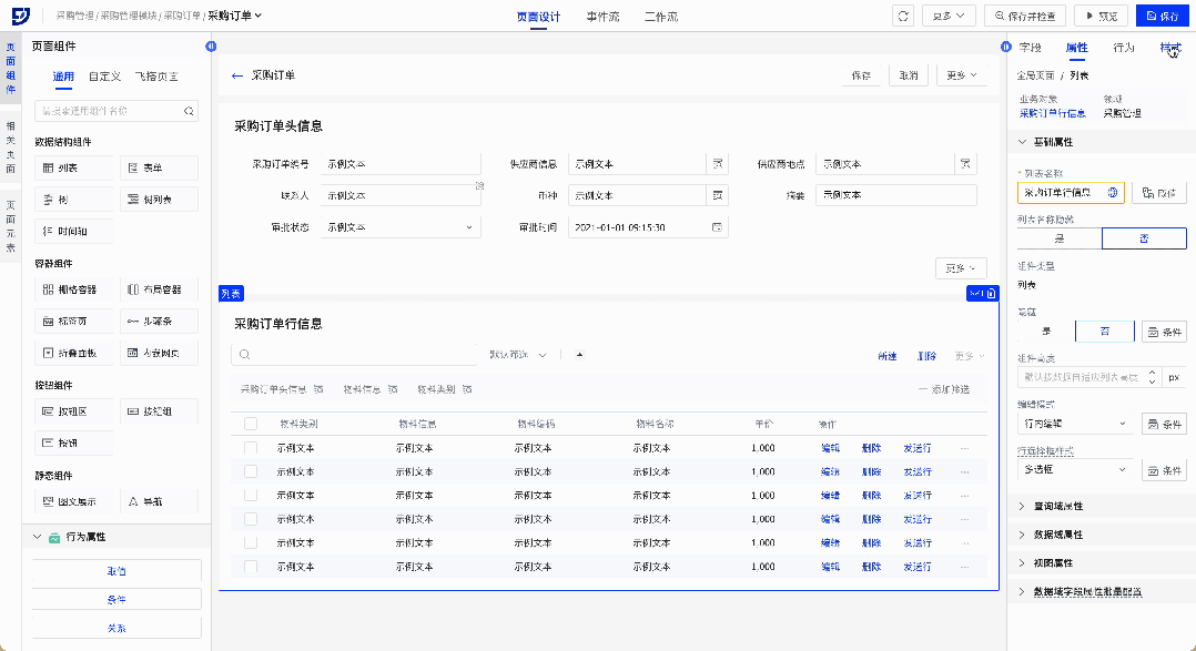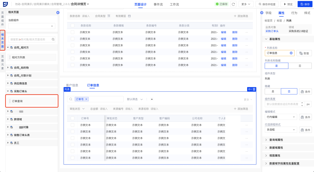 所以在业务实现中,相同的业务信息往往在多个单据呈现。传统开发需在单据页面重复开发,而飞搭低代码为提高用户效率,新增配置预设页面,在对象数据源维度设计基础页面,后续关联的单据页面设计均能够直接使用。