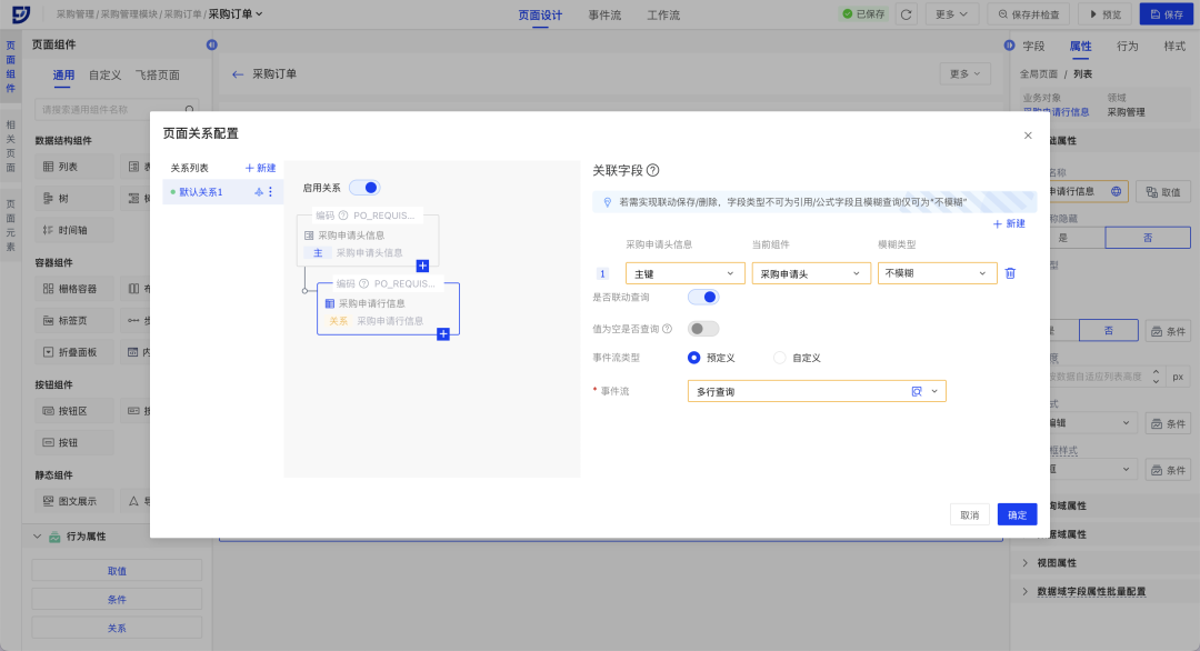 用户在设计页面时,拖拽新增数据结构组件后,飞搭将自动根据组件关联的对象关系生成默认关系,能够快速实现数据的联动查询、联动保存、联动删除。