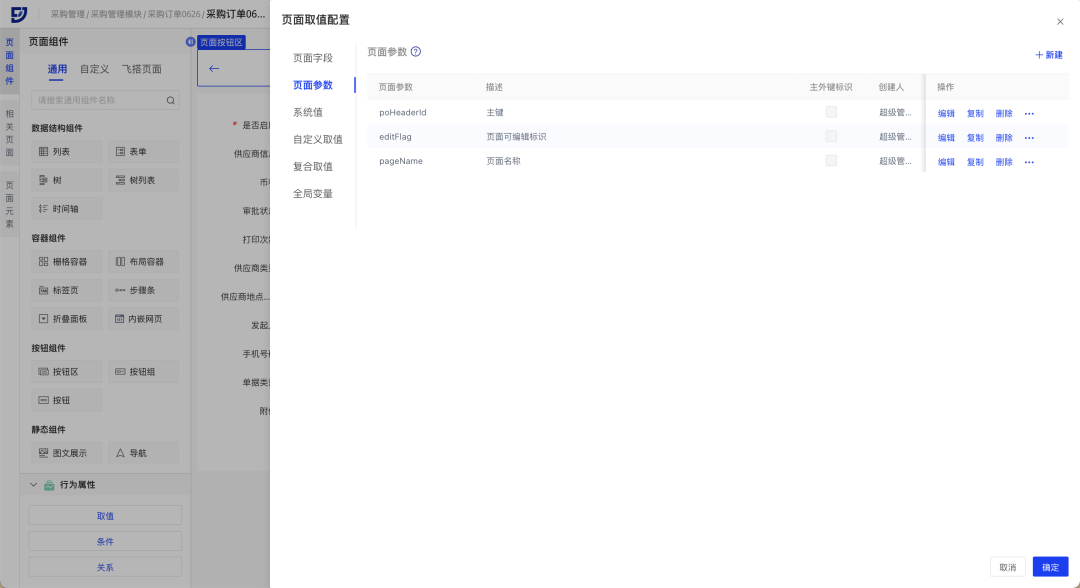 // 场景示例:在采购订单查询页面,配置跳转至新标签编辑页面或弹窗详情页面,仅需在对应页面配置主键等页面参数,并在查询页面跳转节点选择页面参数即可。