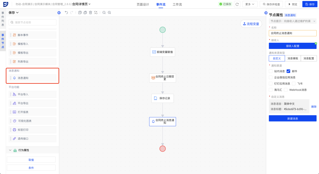 为满足在页面中向指定的接收人发送邮件、短信等需求,PC端及移动端事件流新增消息通知节点,支持向接收人在各类渠道发送消息通知。