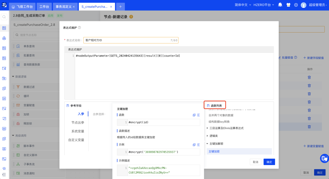 事务处理流为实现更强大的数据处理能力,新增多种数据操作节点以及多种SpEL函数,例如新增加/解锁节点支持为数据增加分布式锁与解锁、新增主键加解密函数、日期和时间戳互转函数等。