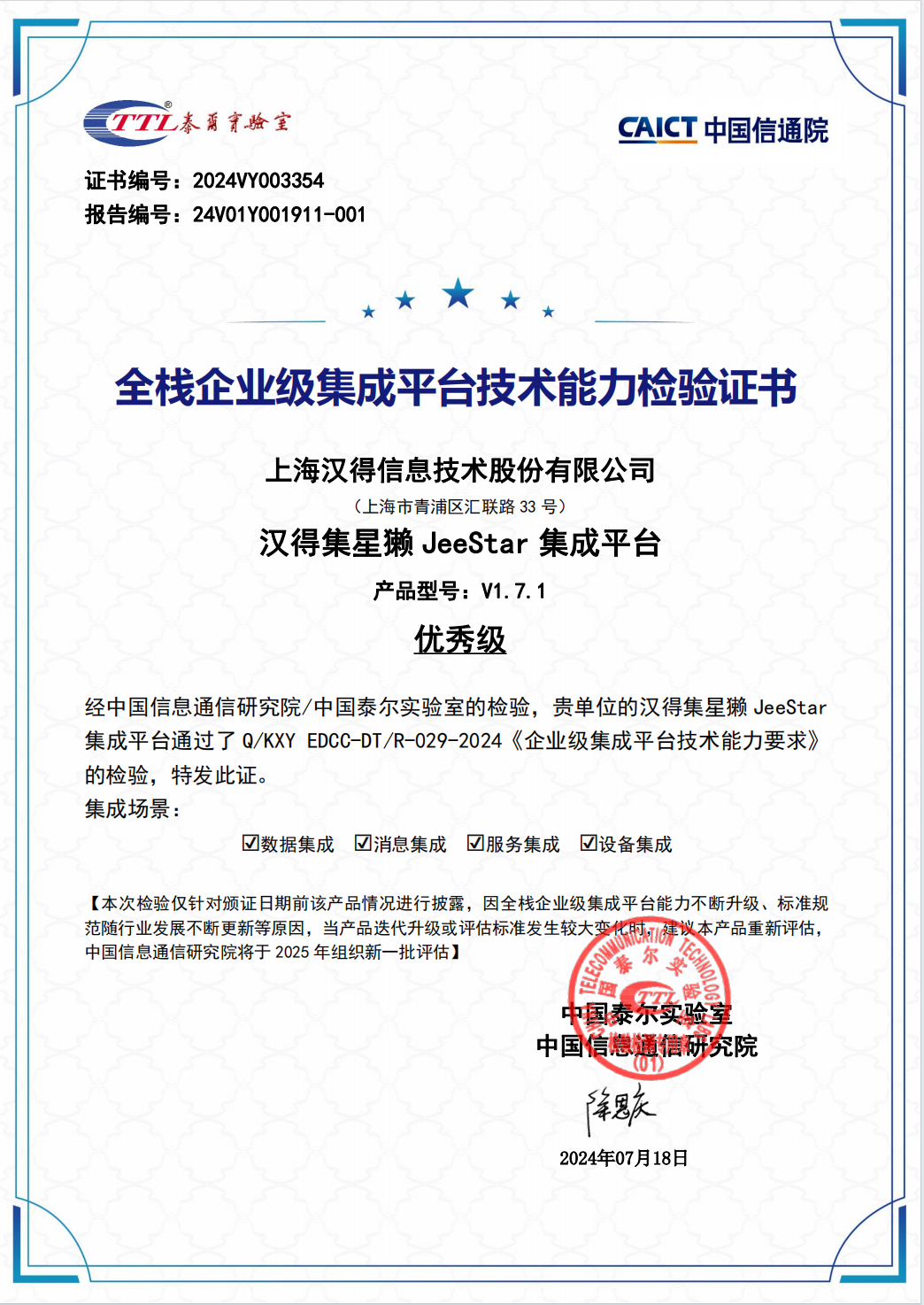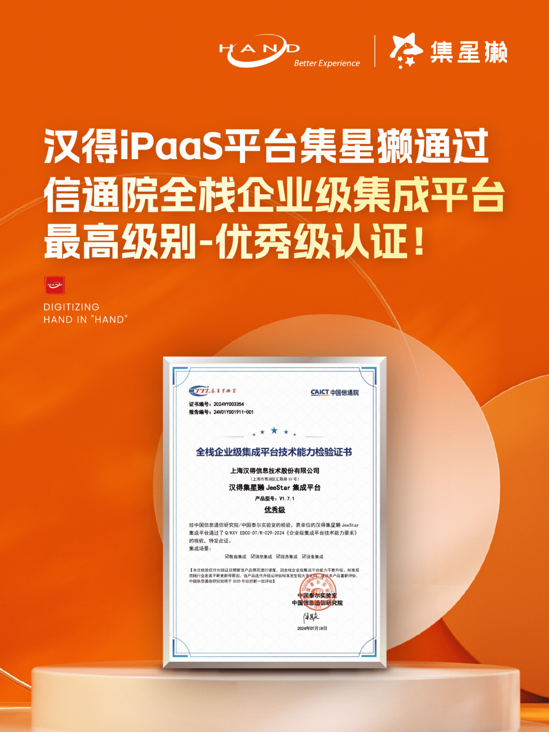 万象城AWC集星獭JeeStar集成平台(简称集星獭),顺利获得中国信息通信研究院(以下简称“中国信通院”)组织的《企业级集成平台分级能力要求》评估检验,并荣获“全栈企业级集成平台技术能力检验”的最高级别优秀级认证!这也标志着集星獭JeeStar在数据、消息、服务、设备四大关键集成场景领域达到行业领先水平。