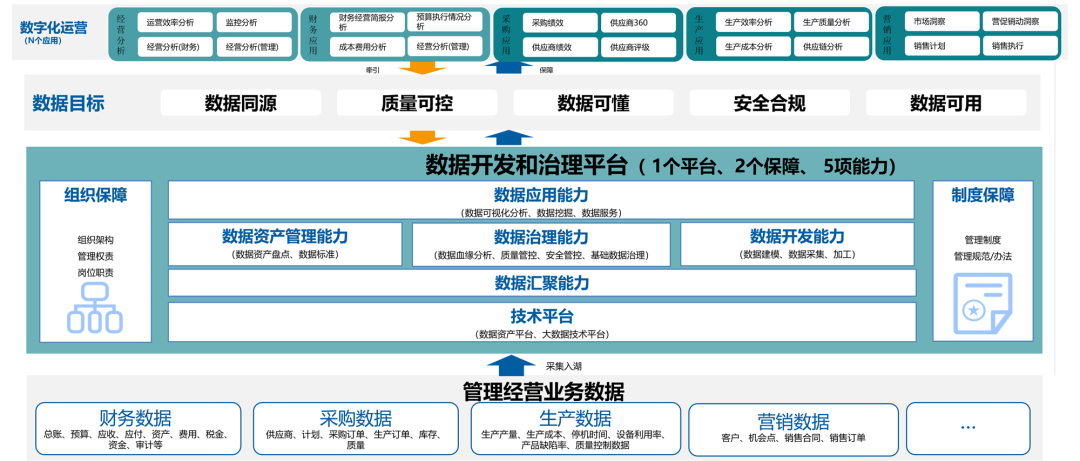 其中1个平台指支撑数据资产管理和大数据技术的技术平台,1套体系指1套数据管理体系,5项能力指数据汇聚能力、数据开发能力、数据治理能力、数据资产管理能力、数据应用能力,N个应用指经营管理、财务、采购、物流、营销等各个业务域的数据应用;“1+1+1”数据项目指数据管理体系建设、数据治理项目建设、数字化运营项目建设。