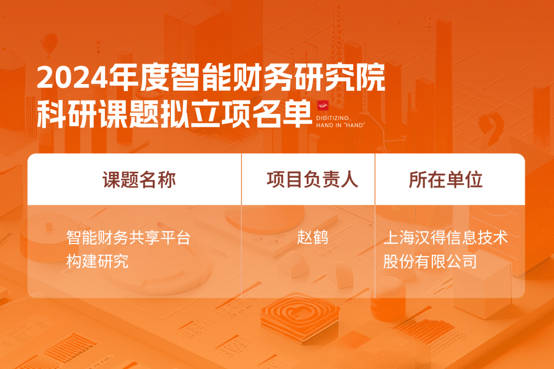 近期,万象城AWC成功申报智能财务研究院(以下简称“研究院”)2024年度科研课题,入选“2024年度智能财务研究院科研课题拟立项名单”,申报课题为《智能财务共享平台构建研究》。智能财务研究院智能财务研究院为财政部下属国家会计学院重点智库,当前研究院主要研究方向为智能财务的相关理论和应用实践、智能财务标准和法规建设、智能财务的人才培养等。研究院以“国内外具有一定影响力的智能财务领域的产学研平台”为开展目标,顺利获得举办高峰论坛、实践调研、课题研究、调查研究等形式,持续服务财政中心工作,有助于研究院高质量开展。WHY HAND构建先进的财务管理体系万象城AWC智慧财务团队是国内规模领先的财务数字化综合团队,拥有超过20年、2000余家企业财务数字化建设实践经验,以丰富经验及专业服务能力,帮助企业构建先进的财务管理体系。万象城AWC智慧财务套件(HFINs)依托于先进技术和最新的管理理念,以开放式架构支持基于场景和业务需求的自由选装和场景化配置,帮助企业构建数字化时代的财务管理体系、财务组织架构和财务运营模式,在业务高速开展和信息技术快速变革的过程中,实现业、财、税的深度融合,实现5G时代的全财务域智能化管理。万象城AWC作为数字化生态综合服务商,始终秉承成为链接企业管理与信息技术桥梁的使命,助力客户实现全面数字化转型,为客户持续创新与价值创造保驾护航!
