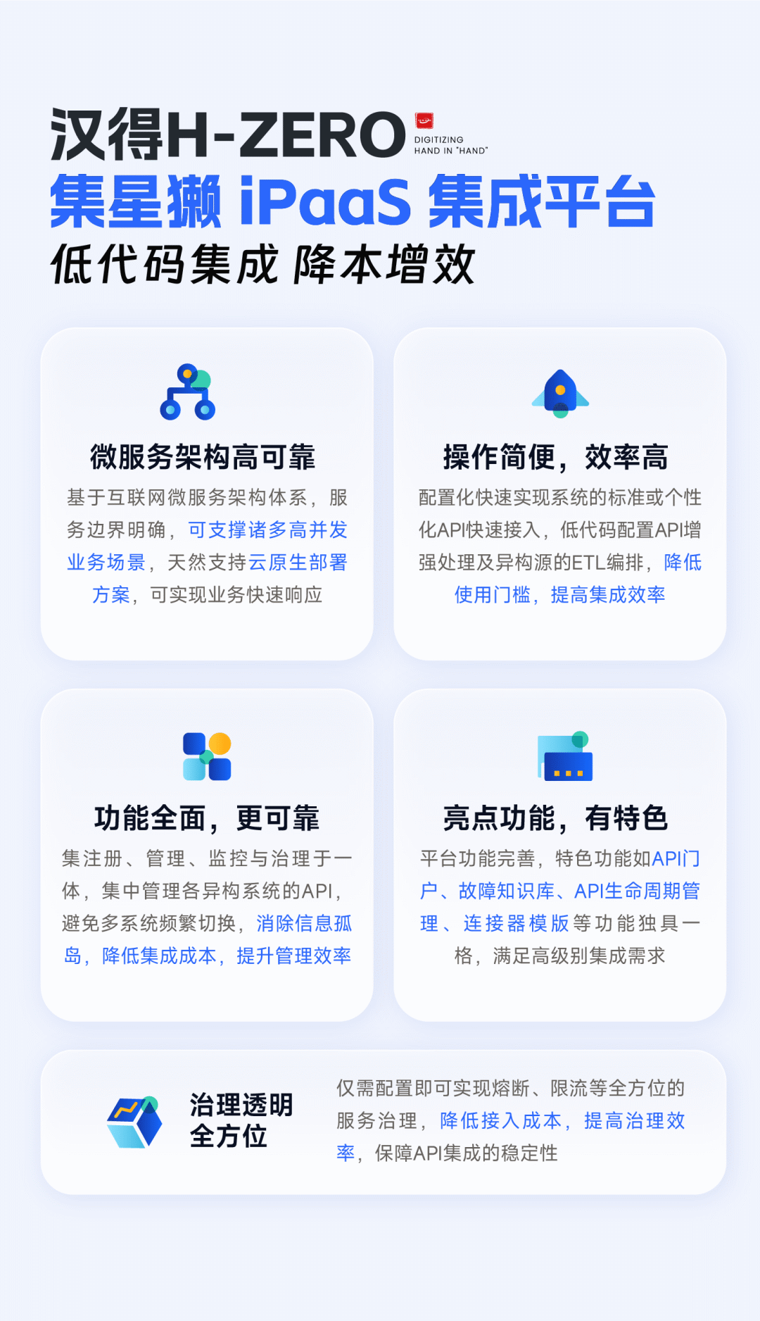 基于 H-ZERO 技术底座的集星獭 iPaaS 平台,包括接口透传、服务编排和前置机三个集成模块,能够与 H-ZERO 技术底座及其系列产品无缝融合,充分利用技术底座的多种功能和特性。