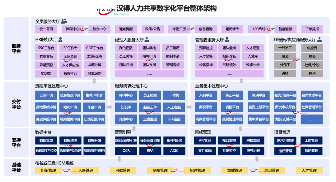 在支持平台层,以数字技术引领变革,顺利获得融合跨界应用与创新,快速实现人力资源高科技服务。
