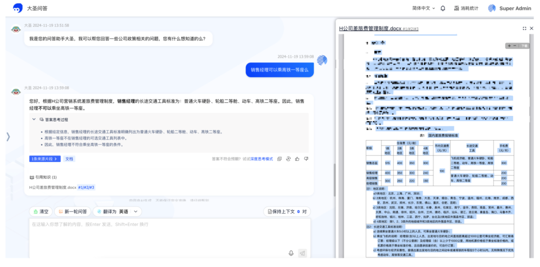 可以看到,升级后的智能知识助手,在这种非常复杂的情况下准确地识别了内容及逻辑,给出准确答案。我们还可以进一步尝试难度更大的识别,如下询问交通工具标准: