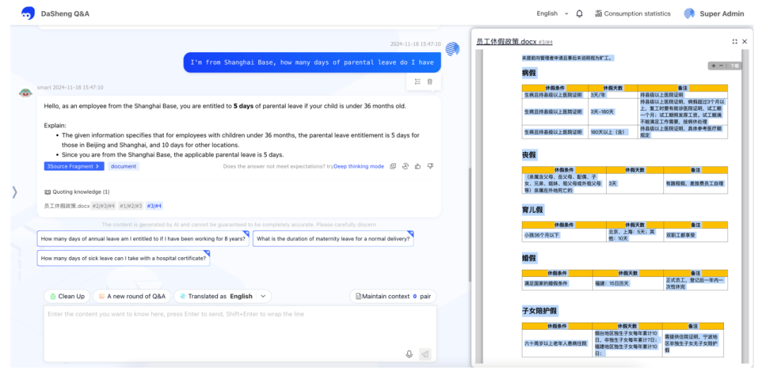 例如,A企业只有一套中文的知识文档库,在欧洲的子公司,用户用英语提问,系统匹配到相应的中文内容,并转换为英语反馈给用户。