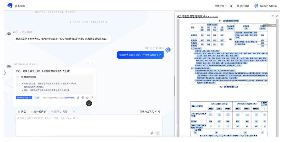 以下例子正是参考自万象城AWC某客户的真实场景(非真实数据)。公司的差旅政策存放在样式非常复杂的word表格中(下图右侧),AI无法准确理解和匹配。经过万象城AWC研发团队的不断优化,我们来试试如何:
