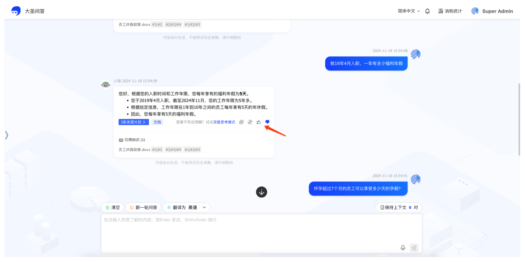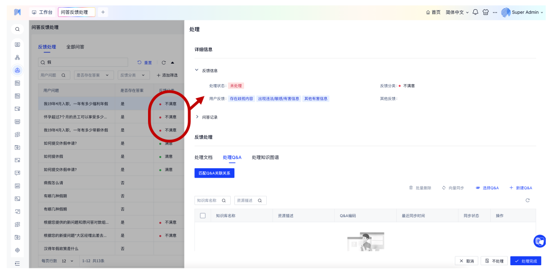 相关管理员可精准定位到用户反馈的低匹配点,及时进行优化,可以是对文档或Q&A的调整,也可以是对相关辅助Prompt的优化。