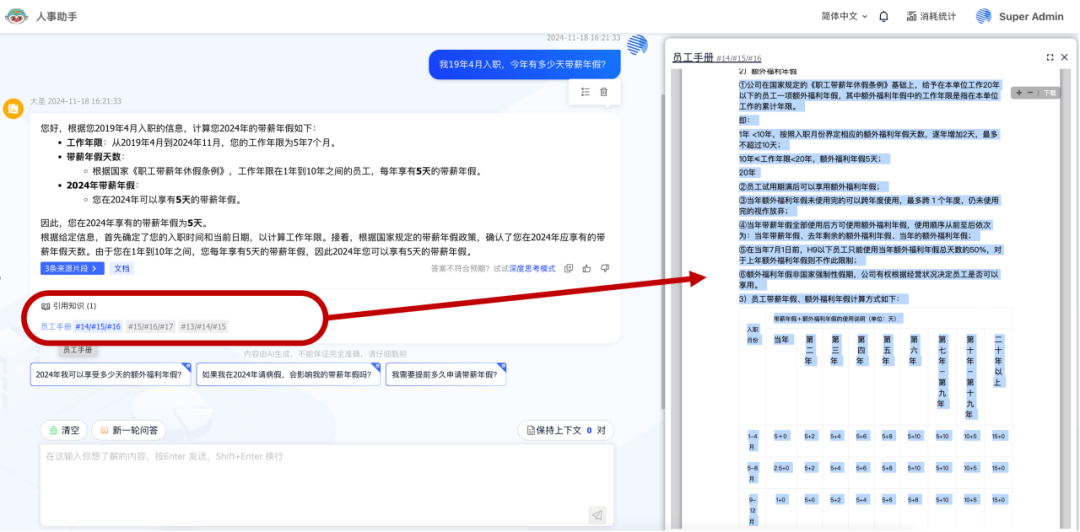对于如此普遍的需求,我们肯定安排上,在知识反馈的下方,给予具体的“片段”位置,用户一键即可直达来源内容。这样即便AI的知识反馈有些不精准,用户也可以顺利获得快捷的定位追溯,快速复核。