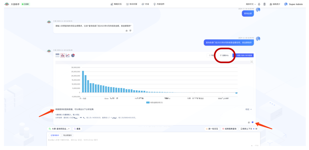 以下图为例, ChatBI不断添加细节,当前版本,能够在每一次查询即追溯背后自动产生的SQL,也能自动做智能的分析总结,也允许用户进行准确度的反馈。