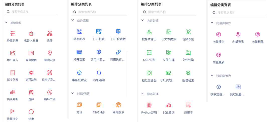 除了万象城AWC已经预置好的成型的功能节点,我们还考虑到,部分企业可能有自己更具个性化的想法,需要更高的开放性,因此我们设计了开放性的节点类型,允许企业自定义或AI动态生成Python、SQL、JS脚本等程序,进行个性化功能的实现。