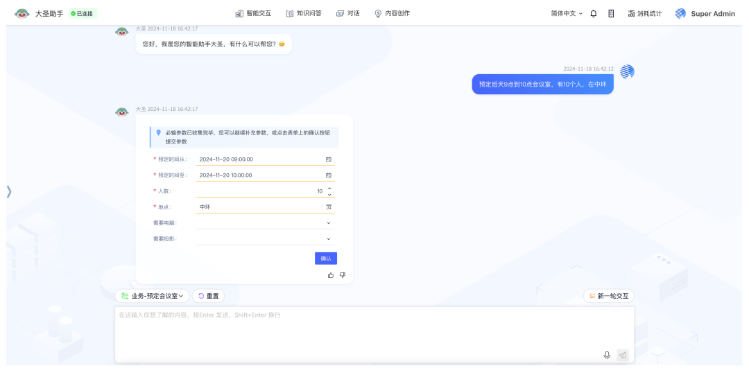 如以下例子,当AGENT识别到用户的需求是要预订会议室,则立即在对话中“生成”一张简易的卡片,方便用户快速反馈信息。用户根本不需要去打开“会议预订”应用(尤其对于很多新入职的员工而言,找各类工作应用是非常痛苦的),数秒即完成工作。
