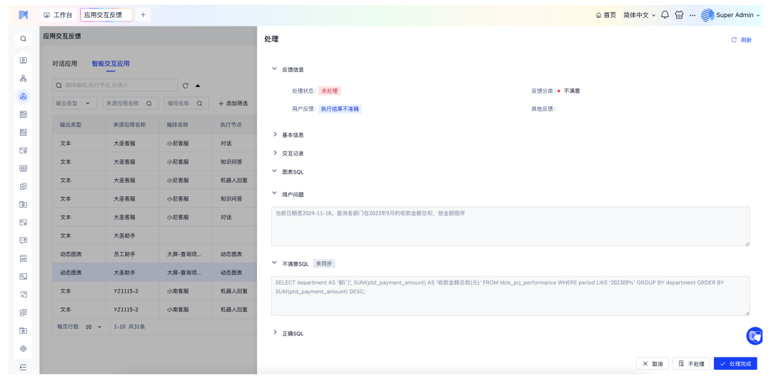 相关管理员可实时收到用户评价反馈,并进行优化处理,沉淀到SQL知识库中,持续迭代优化ChatBI的SQL生成效果。