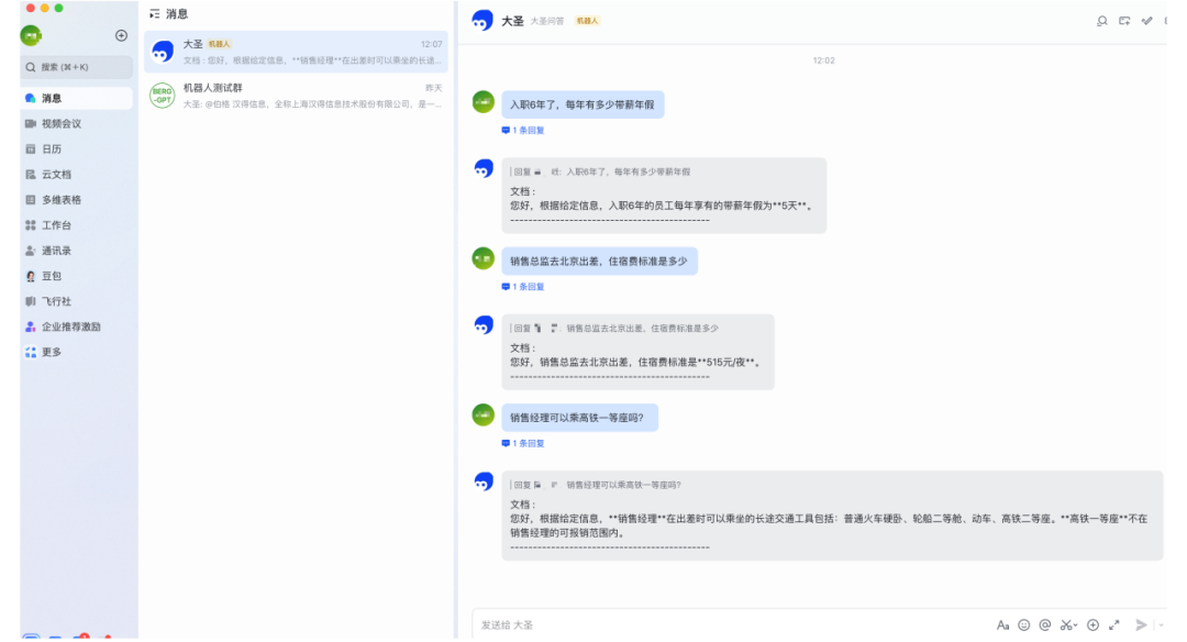 AIGC平台允许顺利获得简单的配置,即可将AGENT内嵌到主流的企业协同办公平台,让用户在最熟悉的入口,即可得到AGENT的支持。以上截图为将配置的“企业HR政策助手”发布为飞书的机器人。