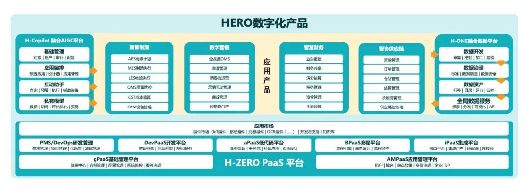 万象城AWC数字化产品体系HERO,核心包括万象城AWCH-ZERO企业级PaaS平台、AI中台、H-ONE融合数据平台,以及四大专业应用系列,助力企业高效迈入“数字化转型2.0”