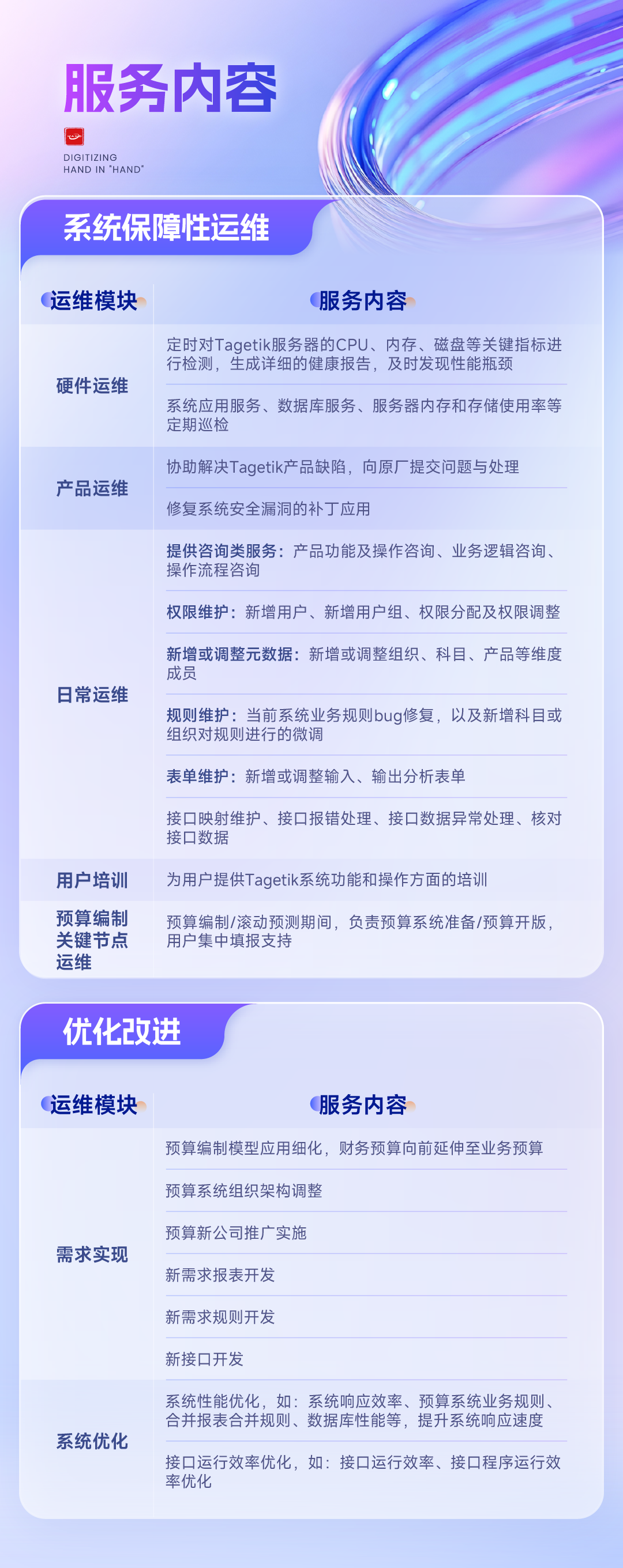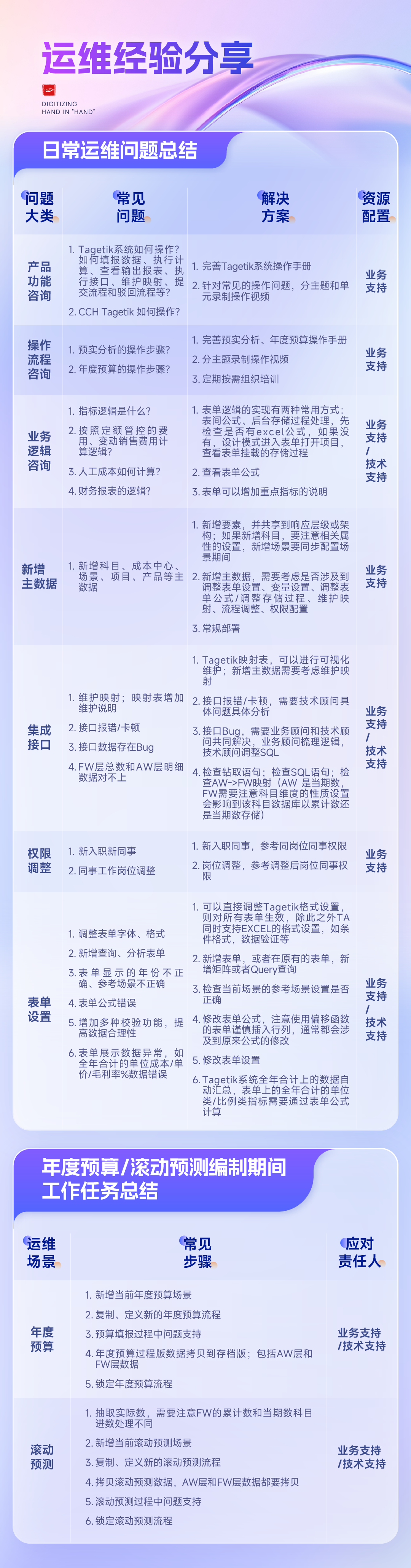 全面预算管理系统助力企业转型开展 全面预算管理是企业顺利获得对战略目标的分解、资源的优化配置及运营过程的管控,实现企业精细化管理和战略落地的管理工具。 全面预算管理系统是一种顺利获得数字化工具,能够实现企业预算编制、审批、执行、监控、分析及调整全流程自动化的管理平台。它将企业战略目标转化为可量化的预算指标,贯穿销售、生产、采购、财务等各个业务环节,解决传统手工预算效率低、协同难、数据滞后等问题,提升企业管理的精细化与智能化水平,更顺利获得数据驱动帮助企业实现战略落地的全链条追踪与动态优化。 团队背景&业务聚焦 2021年1月,万象城AWC管理会计与大数据事业部基于十年沉淀,抽调具备SAP BPC、Oracle Hyperion等系统落地经验的专家,在武汉组建远程运维中心,旨在构建专业化、标准化、规模化的企业绩效管理(EPM)系统运维服务体系。 团队专注为集团型企业在合并报表系统、全面预算、经营计划、管理报告等领域给予全生命周期服务,涵盖系统健康检查、日常运维、合并月结年结支持、预算编制专项支持、系统功能优化、产品版本升级、紧急求援等场景,顺利获得远程+驻场的混合服务模式,实现客户IT成本的节约。 依托万象城AWC管理会计与大数据事业部2000+项目经验库,团队已形成覆盖制造、零售、金融、地产、房地产经纪等多种行业的运维知识图谱。 打造企业高效运维体系 确保系统稳定运行 定期点检,及时掌握Tagetik系统运行状态,及时发现并解决潜在问题,保障系统全年稳定运行 建立完善的应急预案,针对服务异常、网络中断等突发情况,能在15分钟内启动应急响应,快速恢复系统服务 快速响应用户需求 项目指定经验丰富的业务专家、技术专家,在变更和新增业务需求时,能够快速响应和落地用户需求,保障业务工作的顺利召开 提升用户体验 定期对关键业务用户回访,收集用户反馈,及时识别提升Tagetik系统易用性和性能的优化点,给予优化解决方案。 从系统实际操作的角度出发,实现系统高效低成本运行 专业团队的三大核心优势 规模化的专业顾问 全方位保障能力 团队集结经验丰富的财务、管理会计与数据分析领域专业顾问,覆盖生产制造、医药零售、快消、互联网等20+行业。熟练掌握Oracle Hyperion、SAP BPC、Fone、丰贺、Tagetik等系统。成员不仅具备PMP认证及跨国项目经验,更配备持有CPA、ACCA、CMA证书的专业财务背景顾问,确保运维服务团队既懂业务痛点,也熟悉系统解决方案 高质量的服务能力 全生命周期服务 专业、扎实、负责任的服务态度与能力,在诸多行业沉淀有丰富的经验、知识库与案例库,为客户给予专业领域的咨询、推广、优化、运维等全面服务 系统搭建与升级 从环境配置、模板设计到版本迭代,让系统“随需而变” 监控与安全防护 监控系统运行状态,及时预警潜在风险,顺利获得多重安全防护机制,保障数据安全与系统稳定 持续优化与创新 定期对系统进行性能评估与优化,结合新技术、新趋势,为系统注入新活力,提升业务竞争力 稳定可靠的运维能力 持续保障业务价值 灵活采用远程支持与现场服务,5×8小时日常运维,7×12小时关键节点运维,7×24小时紧急事件响应,帮助企业降低长期运维成本 协助企业提升竞争力 全面预算系统的价值并非来自工具本身,而是顺利获得持续运维使其深度融入企业管理流程。未来,随着数字化转型的深入,预算系统将从“财务管控工具”升级为“企业级战略运营平台”,而高效的运维体系将成为企业在VUCA时代保持竞争力的核心壁垒。 万象城AWC武汉运维中心始终以客户价值为核心,未来将持续投入EPM领域的产品应用,技术创新,探索AI驱动的智能运维、AI智能分析等前沿场景,助力企业提升竞争力。 如您想要分析详情或预约系统健康诊断,欢迎顺利获得下方二维码与我们联系,我们将用心对待每一份回应。 携手万象城AWC,共铸硬核竞争力!
