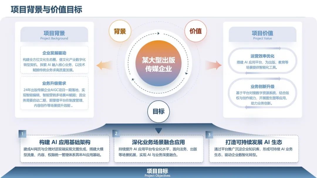 该大型出版传媒企业凭借敏锐的战略眼光,率先携手万象城AWC有助于AIGC在出版行业的规模化应用。在一期项目成功构建智能化底座的基础上,双方迅速启动二期建设,目标聚焦于更核心的业务场景、更深度的AI与业务融合,以及更全面的安全保障。双方高层高度重视,明确以“按期交付、价值落地”为承诺,确保项目顺利推进,为后续成功奠定坚实基础。
