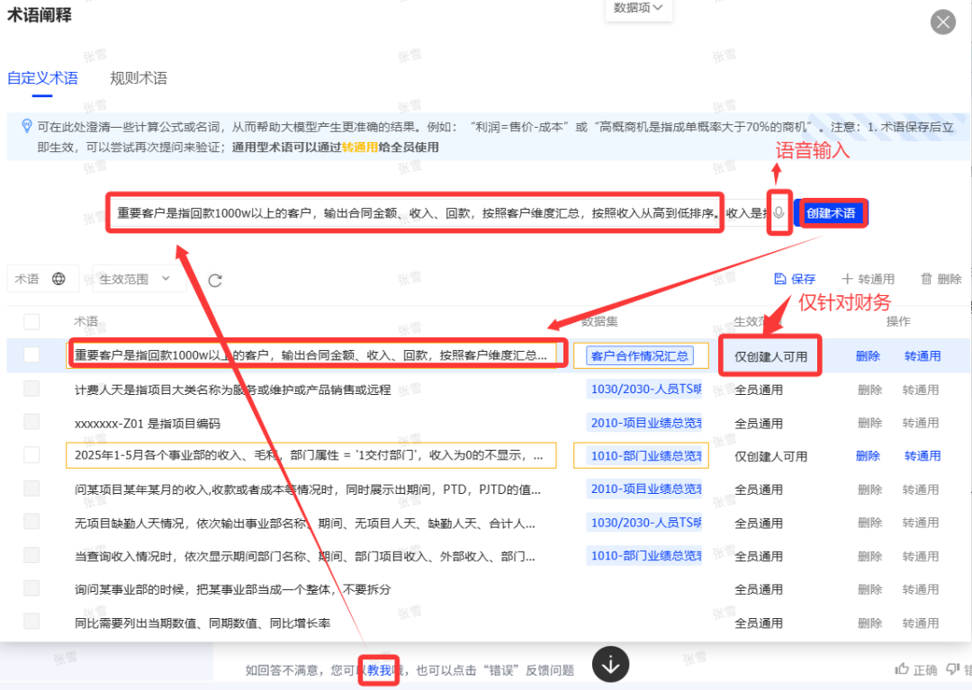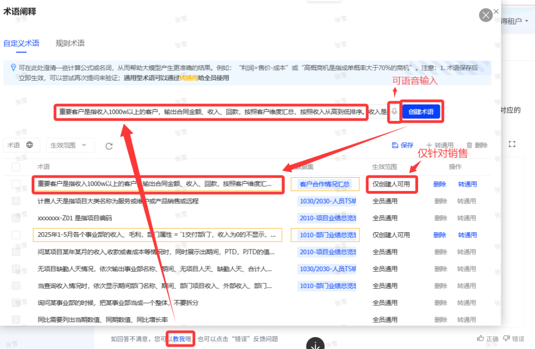 启动私人“教我”模式:不需IT后台穷举处理,直接前端点击“教我”,支持语音输入进行调教。
