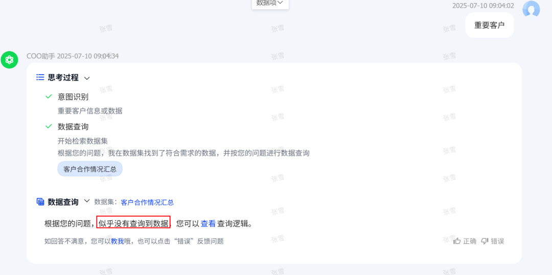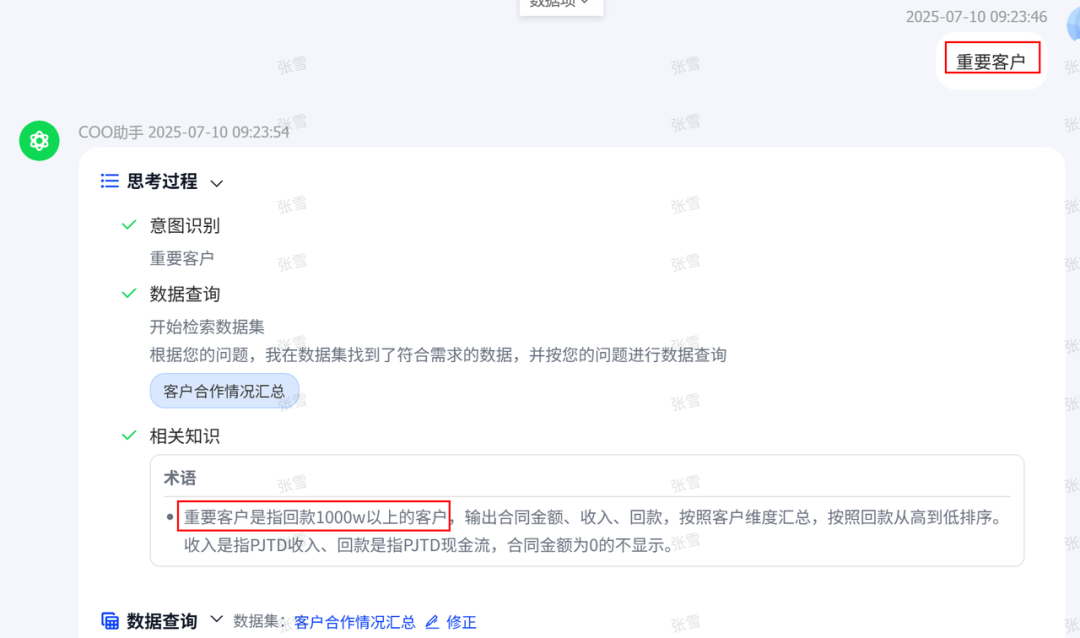 每个企业有自己的“黑话”,每个人也有自己的“黑话”,企业的通用“黑话”可以顺利获得提前训练解决,但个人的问数习惯和个人“黑话”往往成为ChatBI问数的拦路虎。