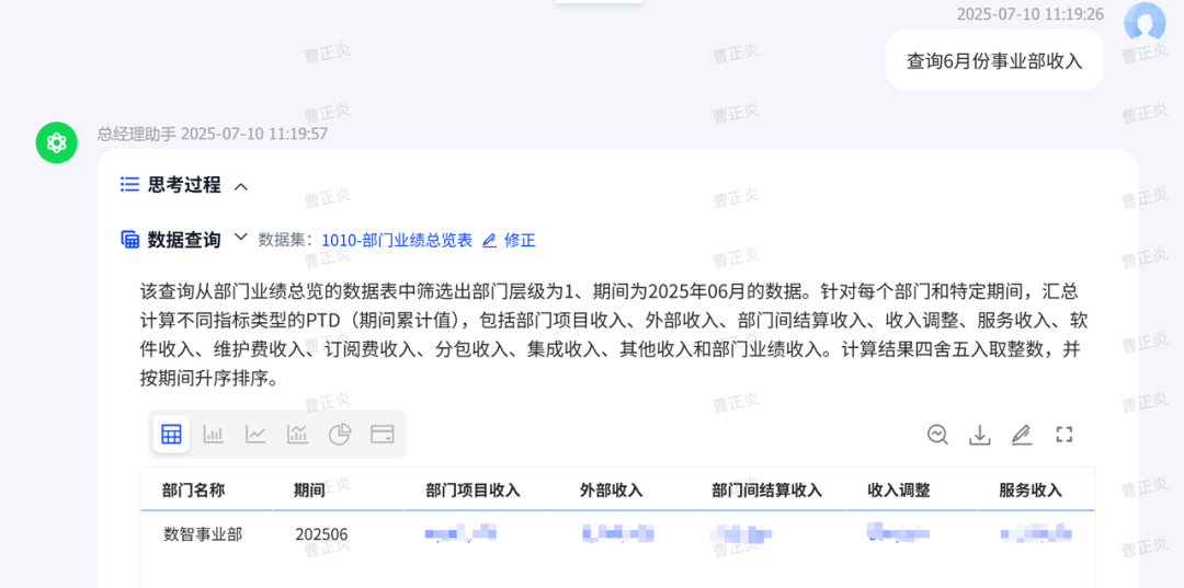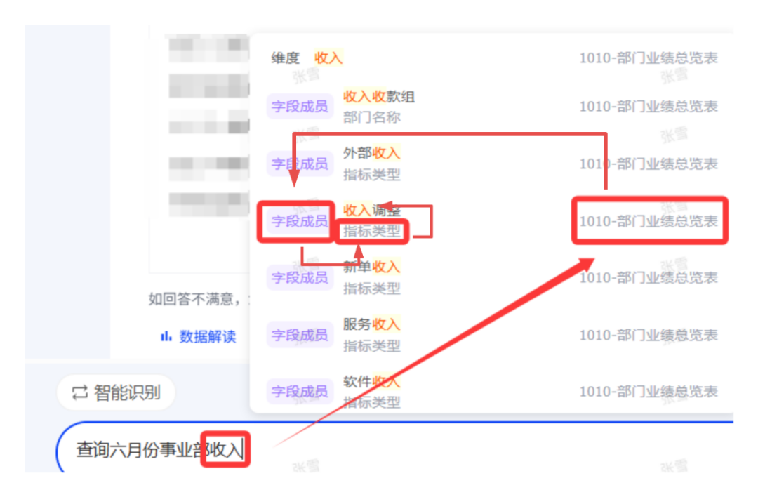 当直接问“查询6月份事业部收入”时,会自动识别所有的“收入”,并给予选择