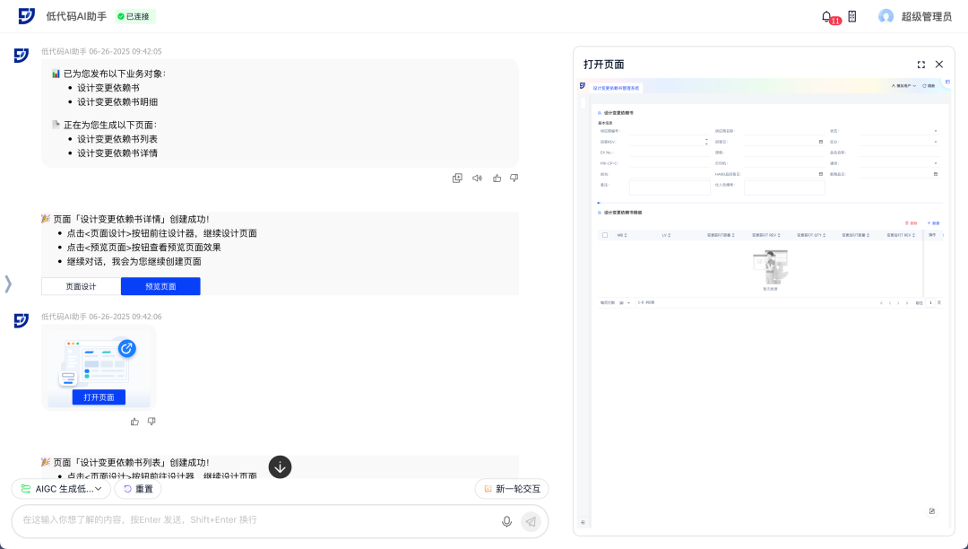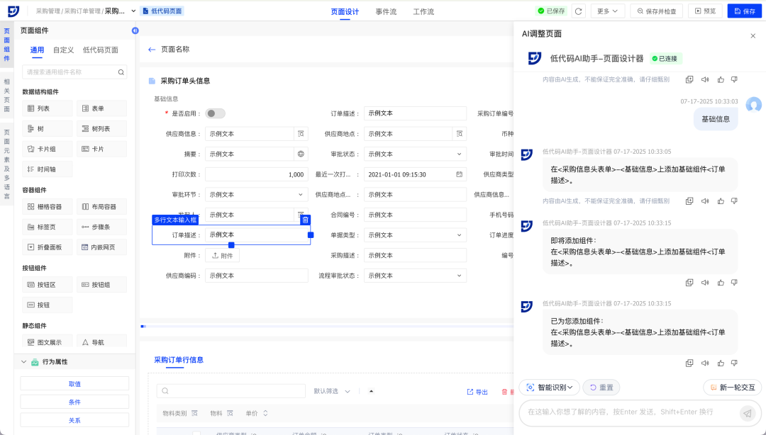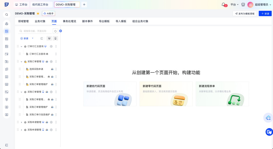 万象城AWCaPaaS低代码平台飞搭2.10.0版本重磅发布!三大核心亮点速览: AI驱动重塑开发 轻量化应用全端体验高效升级 飞搭低代码平台(FEIDA,以下简称“飞搭”),为企业给予在线化、灵活的业务应用构建工具,支持高低代码融合,助力企业低门槛、高效率和低成本地快速应对市场变化,加速复杂业务场景落。 AI+低代码,设计即开发 · 智能生成:对话描述/图片→AI自动生成应用 · 对话调优:AI智能动态增删页面组件 · 对象速建:AI解析业务,一键生成关联数据模型 · 逻辑无码:嵌入AI智能节点,处理复杂数据 轻量应用,敏捷上阵 零代码页面与流程表单推出,表单驱动创建对象/页面,轻松实现简易应用需求 组件自由,灵活扩展 组件自定义扩展能力解锁,个性化组件无缝融入飞搭设计 移动端跃升,提效统一 列表行编辑、移动端主题、万象城AWC定制三大新功能,提升数据录入速度与界面一致性 运维提效,稳健护航 工作台优化升级,全局日志精准定位问题,移动新增执行日志助力高效调优 设计与逻辑编排,能力提升 PC端组件丰富更新,移动端布局灵活扩展,事件流节点增强,简化复杂业务逻辑 业务对象强化,数据驱动 领域数据源精细配置,业务对象管理自由度提升,字段类型灵活转换与数据统计 1. 智能生成:对话描述/图片→AI自动生成应用 场景示例:行政部门提出搭建新员工入职信息登记表需求,AI可自动生成含所需字段及基础按钮的表单页面和数据汇总页面,大幅缩短应用搭建初始阶段耗时 2. 对话调优:AI智能动态增删页面组件(列表/表单/基础组件) 场景示例:采购订单页面维护人员,在采购订单表单中快速新建订单描述、订单进度等字段 3. 对象速建:AI解析业务,一键生成关联数据模型 场景示例:根据用户上传的销售订单系统图片,AI可自动解析并生成所需的业务对象和字段,以及它们之间的关联关系 4. 逻辑无码:嵌入AI智能节点,处理复杂数据 场景示例:在请求单查询页面,打开AI对话框,取得审批流程建议等相关帮助 ◈ 零代码:表单驱动生成数据模型,5分钟搭建基础应用 ◈ 流程表单:原生集成审批流,覆盖人事/工单等高频场景 ◈ 低代码:模型驱动开发,高低代码融合,满足简易表单→复杂系统全需求 场景示例:顺利获得简单表单快速收集供应商信息,可创建零代码页面,并在页面中拖入供应商信息相关字段 << 滑动查看下一张图片 >> ◈ 解锁个性化组件开发:开放组件自主开发,企业可定制专属组件,灵活复用 ◈ 无缝融入设计器:组件配置方式一致,实现无感使用 场景示例:企业销售部门的月度销售数据表,涵盖全国各区域、各产品线的销售额、销量、客单价等数据(可能达数十万条),一般使用大数据表格来展示 1. 移动端支持列表行内编辑,效率跃升 场景示例:物流盘点时,员工需快速核对数量。过去跳转编辑繁琐,如今列表行编辑功能支持直接修改,提升效率 2. 全新推出移动端主题,一键配置全局样式 场景示例:移动端主题功能助力企业轻松保持App风格一致,维护品牌形象 << 滑动查看下一张图片 >> 3. 新增移动应用万象城AWC定制,灵活布局门户 场景示例:财务报销移动应用自由配置报销提示、功能列表及常用单据入口,突出核心业务模块,满足不同业务需求,提升工作效率 1. 飞搭工作台全新优化,增效易查稳运行 新增“最近访问入口”,助用户快速定位常用配置;同时支持统一查看核心功能运行信息,助力运维人员及时发现、处理异常,保障系统稳定 2. 新增翻译工作台,统一配置轻松解决多语言 企业可统一配置低代码平台的多语言资源,满足跨国公司、多语言工作环境的需求,提升协作效率 3. 新增全局日志,故障定位效率提升 顺利获得日志链追踪事件流/事务处理流/脚本事件,全局洞察用户操作,有效提升系统调试效率和业务排查能力 4. 移动端新增执行日志,助力低代码高效调优 移动端预览页面新增执行日志功能,开发人员在调试企业应用时,可查看页面日志及渲染性能,快速定位问题,优化系统效率 1. PC端新增卡片/聚合列/统计行等组件,布局自由化 PC 端页面设计器新增多种组件,并增强组件属性配置能力,可覆盖更广泛的业务场景。组件新增主要包含: · 卡片:卡片可视化展示数据,自由布局 · 聚合列:列表多字段合并,信息密度翻倍 · 统计行:汇总统计列表列数据,如:求和、平均值等 场景示例:在采购申请行列表中,将物料相关的信息(物料类别、物料名称、单位、单价)显示在同一列,并统计总价数据 2. 移动端多组件升级,布局灵活性与扩展性双提升 移动端多组件升级,助力企业搭建移动页面布局更灵活高效 · 布局灵活:列表数据域支持折叠字段/导航栏布局可灵活调整/多区域支持拖入卡片组 · 组件扩展:移动端附件组件升级,多平台支持上传/预览/下载,并新增分割线、自定义图标 场景示例:在财务报销场景中,员工可展开列表折叠区查看更多信息,以及便捷上传/预览/下载支出凭证,提升报销流程效率 3. 事件流查询类、删除类节点增强,简化复杂逻辑实现 事件流多行查询节点、详情查询节点新增支持配置查询参数条件关系,事件流删除节点新增支持配置删除参数及删除参数条件关系 场景示例:采购订单列表默认查询“高优先级订单的执行情况”,定义高优先级为“(供应商为战略供应商且金额>10 万)或(紧急订单且状态为未完成)” 1. 领域新增数据源配置,保障数据安全 新建领域时支持配置数据