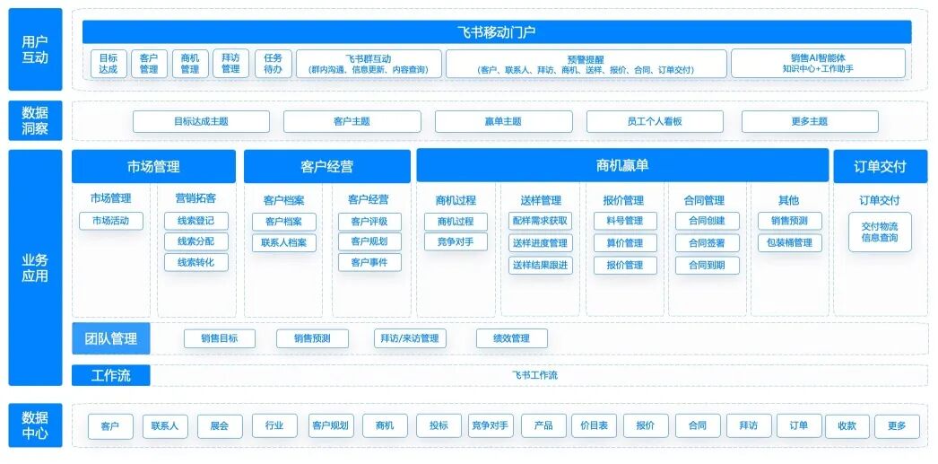 本次项目将深度整合AI能力,从客户管理、商机复盘、拜访沟通、员工知识、竞对管理等十多个场景,基于飞书移动端,实现AI与业务流程和员工一线使用的深度融合,帮助销售一线员工的深度赋能