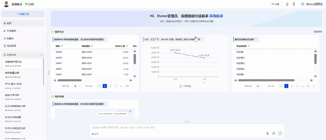 “查询异常物料清单并分析原因”、“每个月的订单数量差异”等常见关心的问题,虽然能直接顺利获得问答快速出结果,但还是需要每次重复提问,等待数据结果