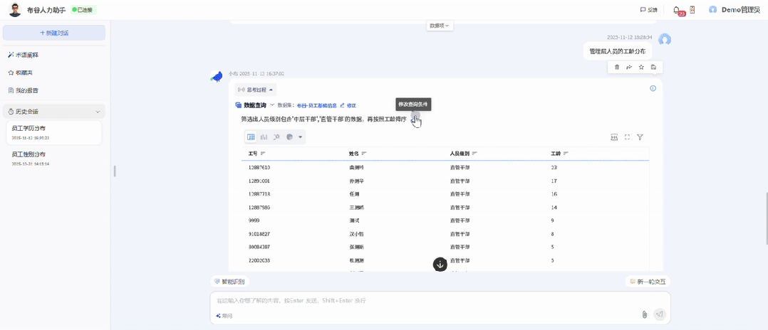 HR直接提问“管理层人员工龄分布”,系统秒回结果。直接在表格上操作勾选、排序、计算等。调整实时生效,全程仅需几次点击,像操作Excel一样简单快捷,实时调整至完美