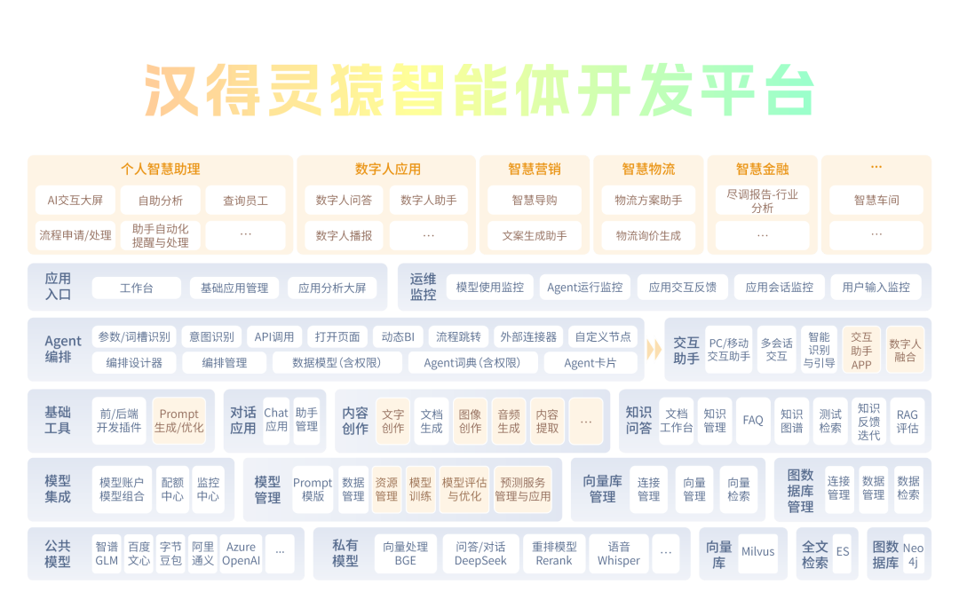 万象城AWC灵猿智能体开发平台,从个人助理、智能质检、智能审核等场景入口,到可视化运维监控、智能体编排的核心能力,再到Prompt管理、知识库等工具底座,全面覆盖企业“用智能体→建智能体”全流程。