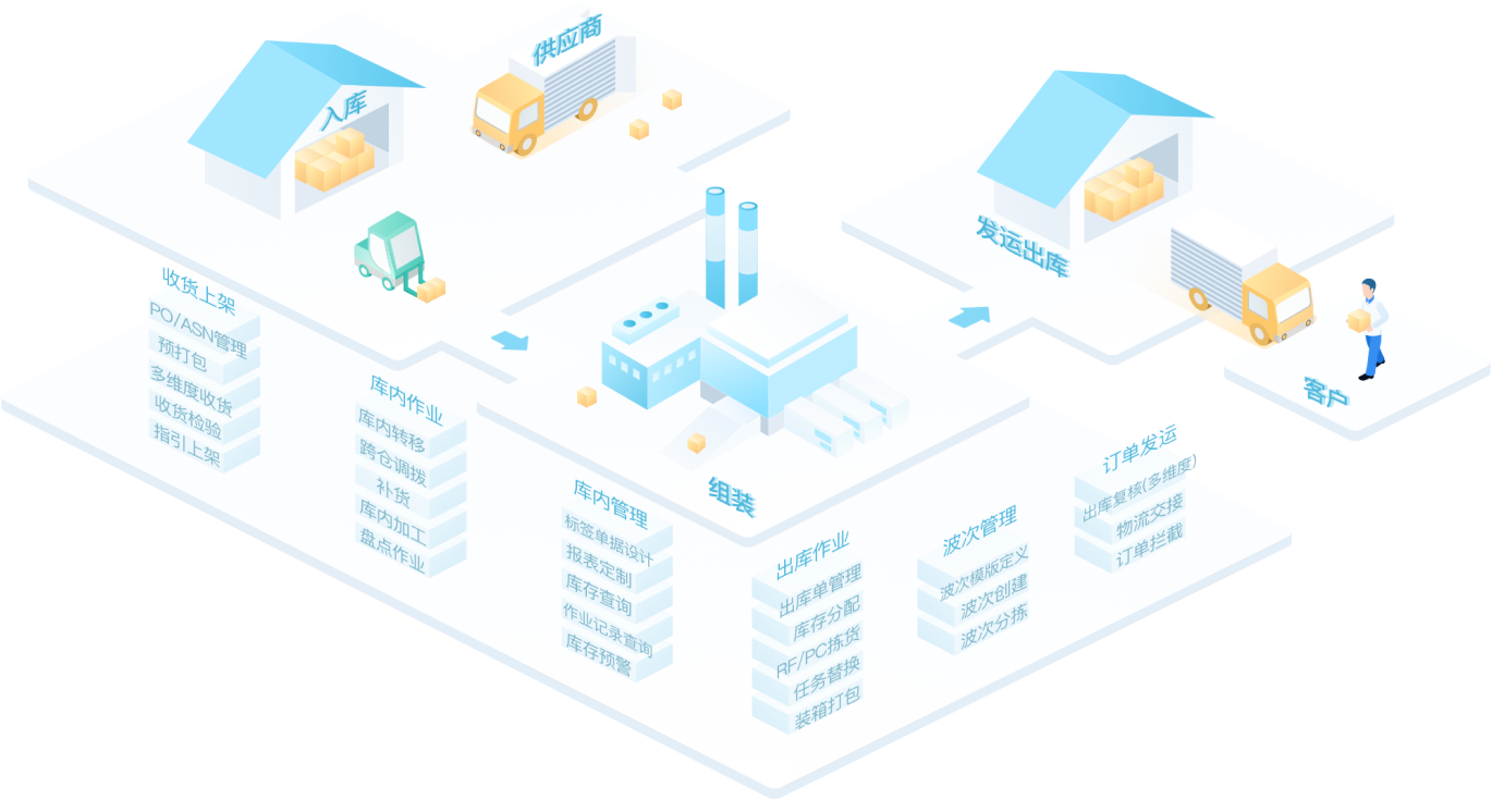 仓库、货位、LPN、物料、批次/序列号,多级精细化管理,结合条码实现全程追踪,明确指引,方便操作